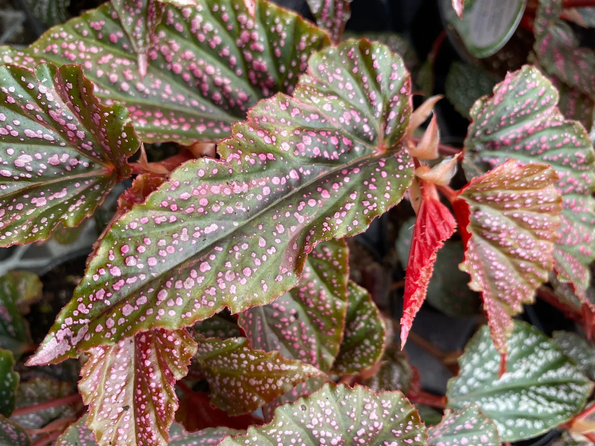 Begonia Maculata Pink Spot feature stunning leaves with a pink-tinted underside and pink or silver spots spots. They also have vibrant, eye-catching flowers. These are often called “angel wing” Begonia.